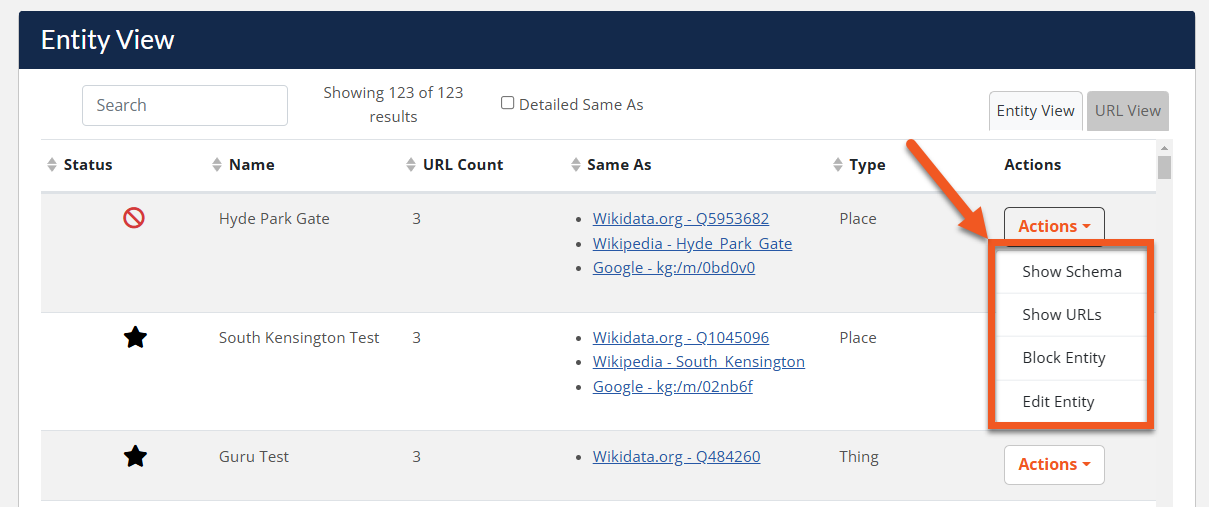 - Show URLs: Shows a list of the URLs where this entity has been identified