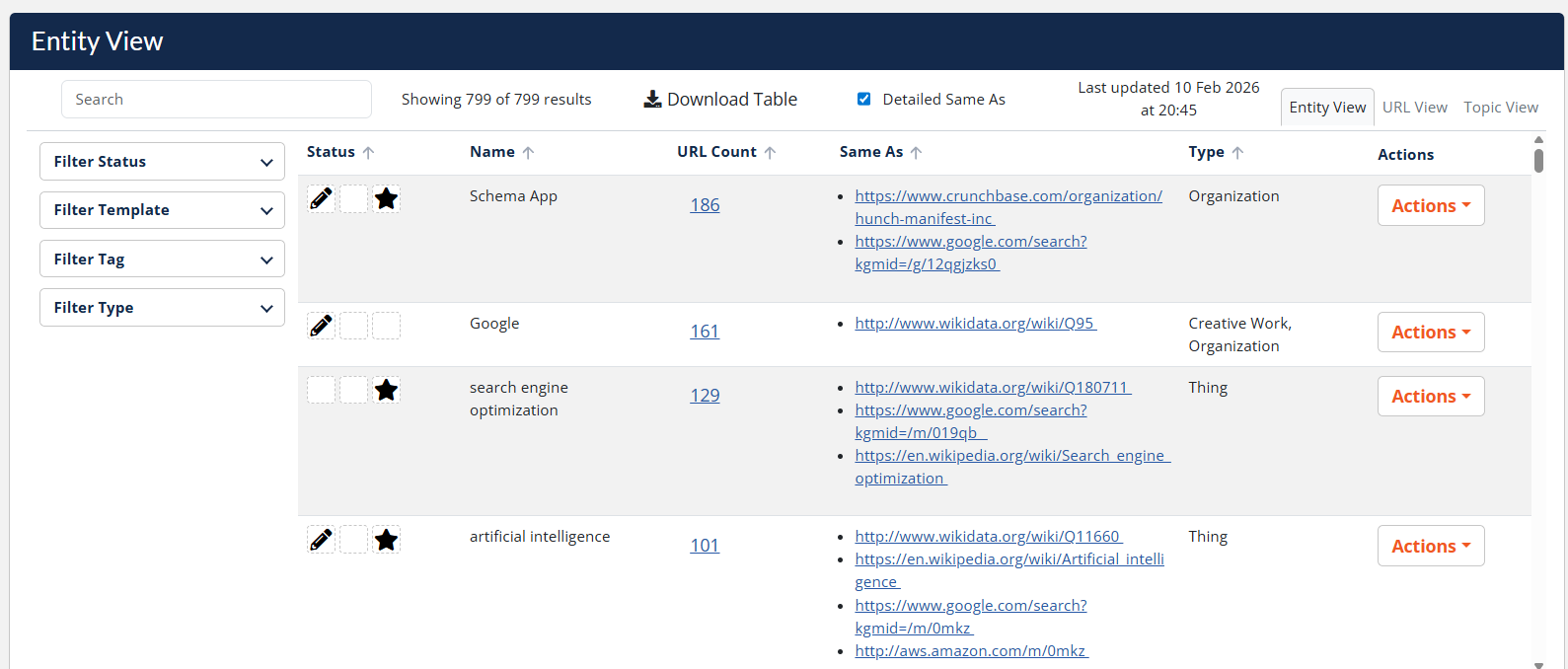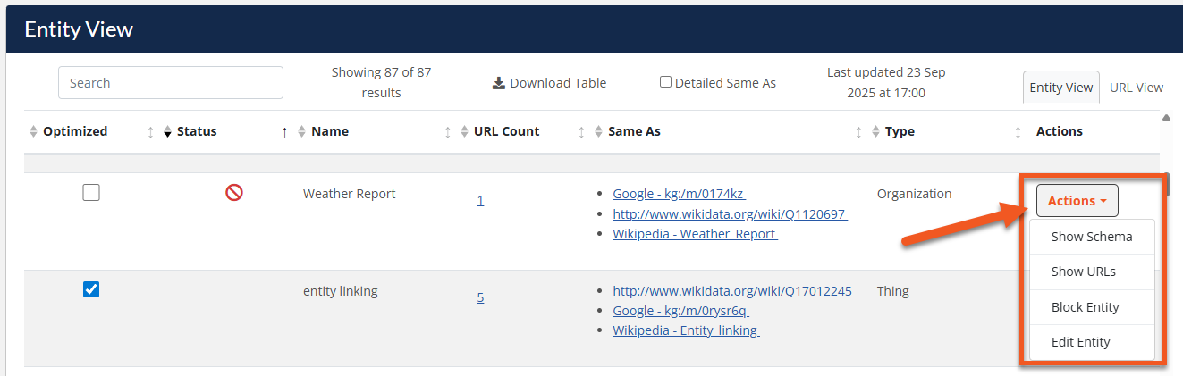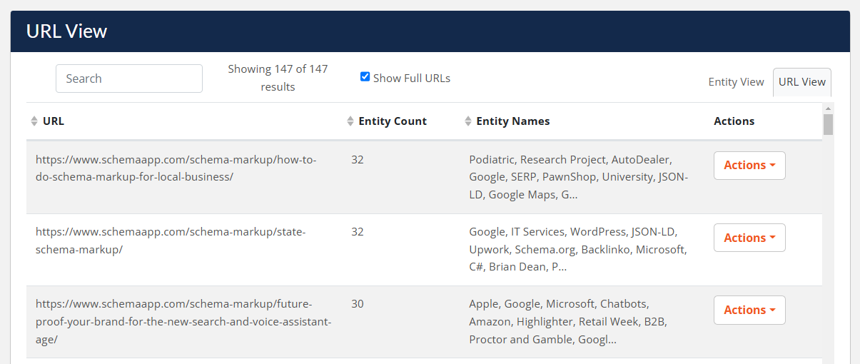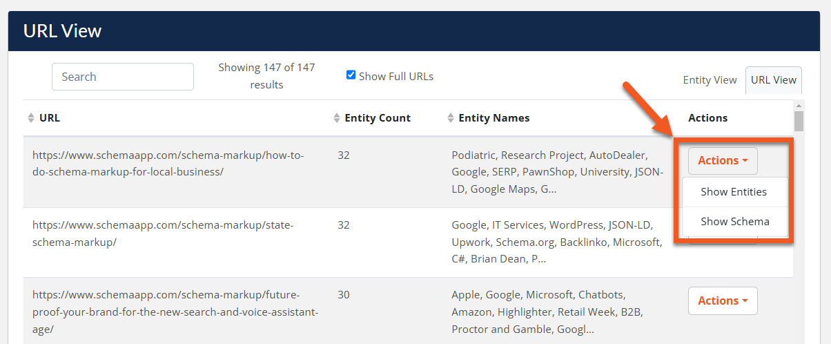 - Show Schema: Shows the schema markup embedded on URLs containing this entity