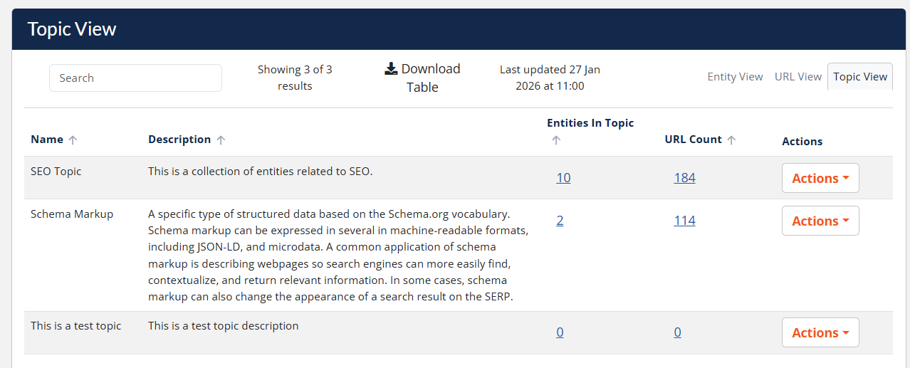 The Topic View presents the breadth of coverage for entities related to a broader topic across a page set. By reviewing this report, users can understand how widely each topic is covered across their content, helping to identify opportunities for content expansion and ensuring comprehensive coverage